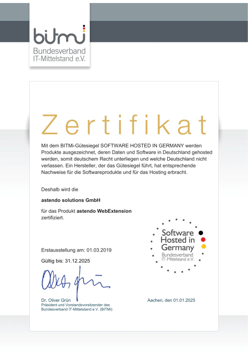 Bei astendo steht das Thema Datensicherheit im Mittelpunkt. Unsere B2B-Softwarelösungen werden ausschließlich in deutschen Rechenzentren betrieben – zertifiziert und zuverlässig.